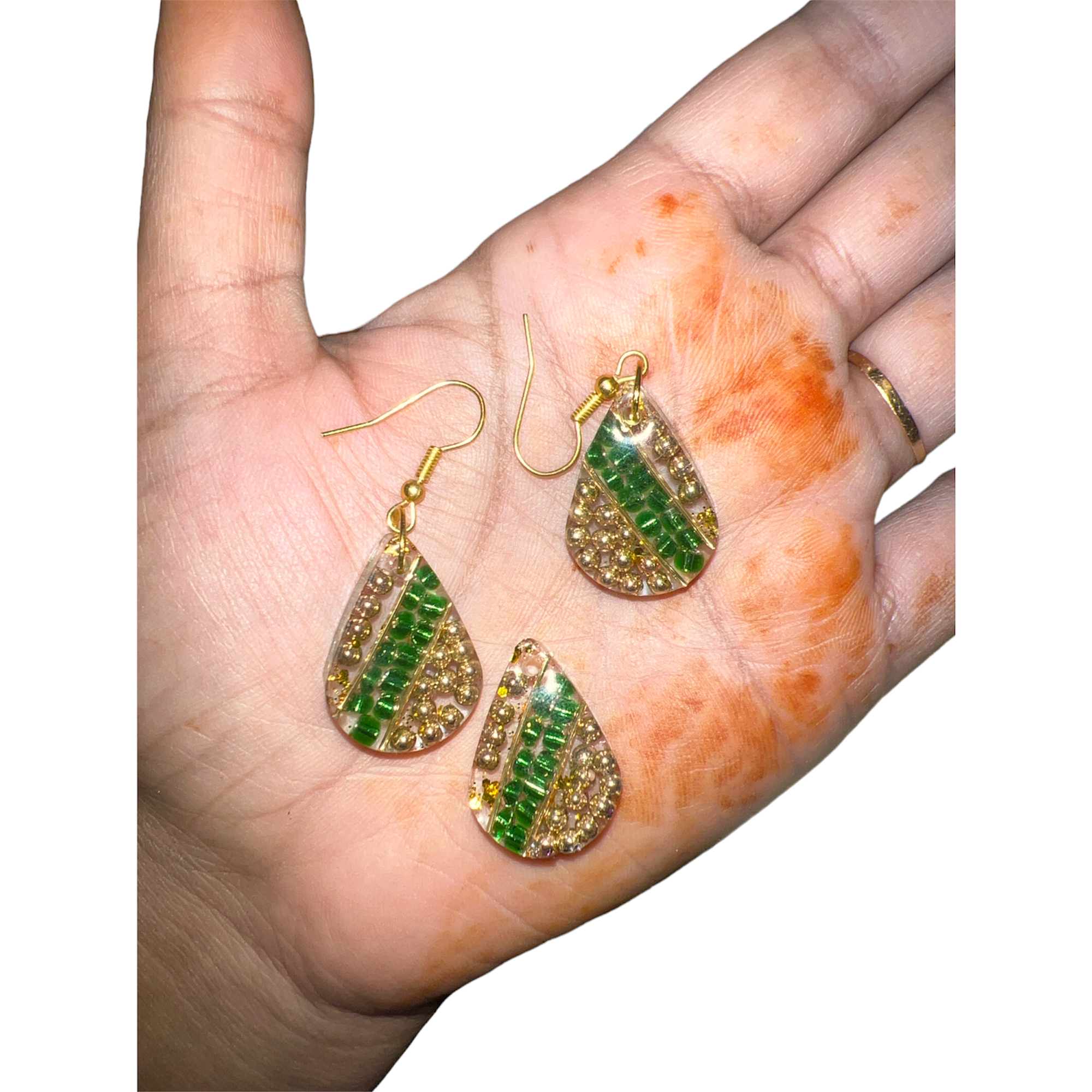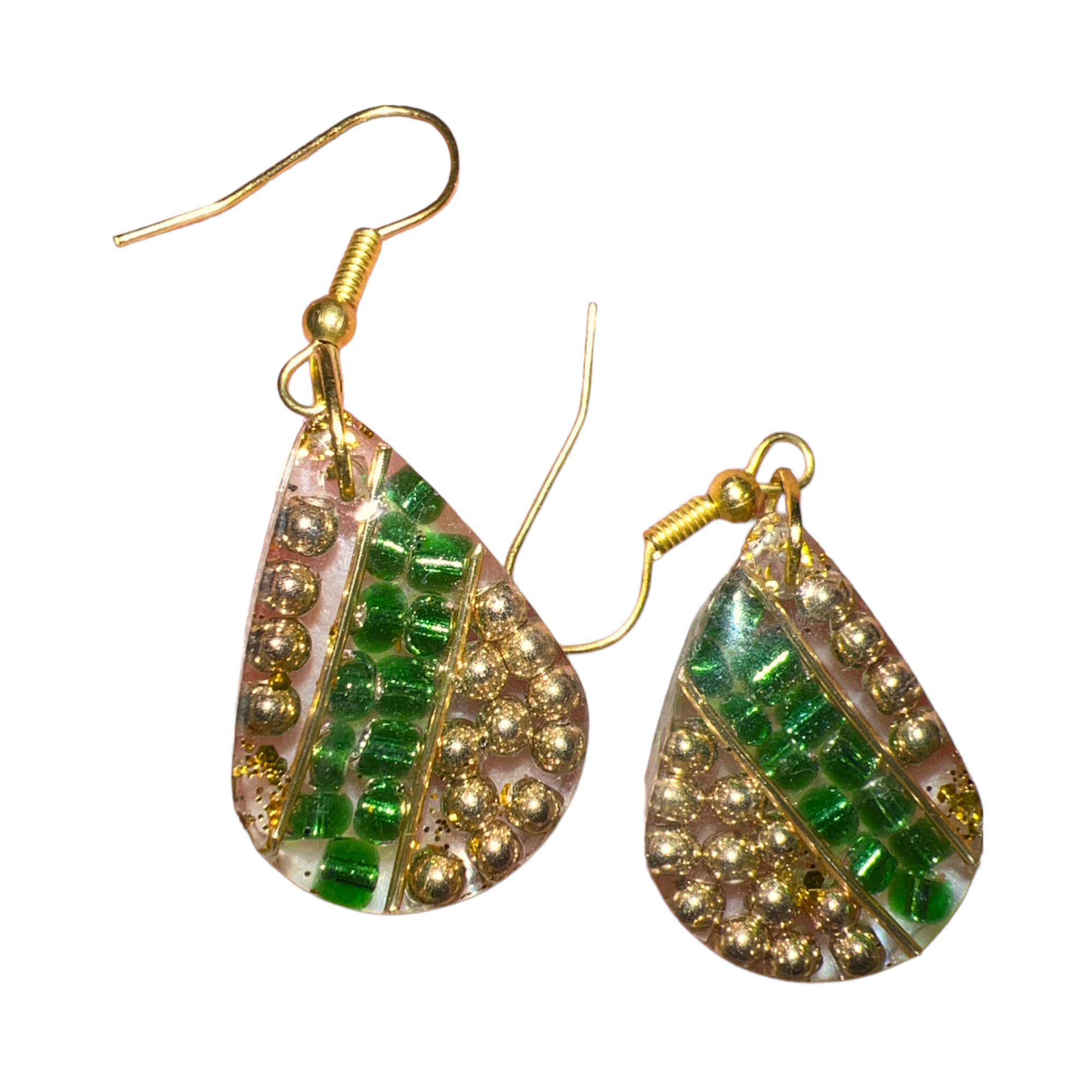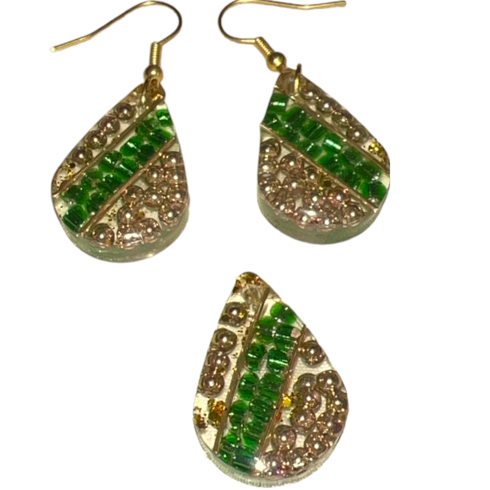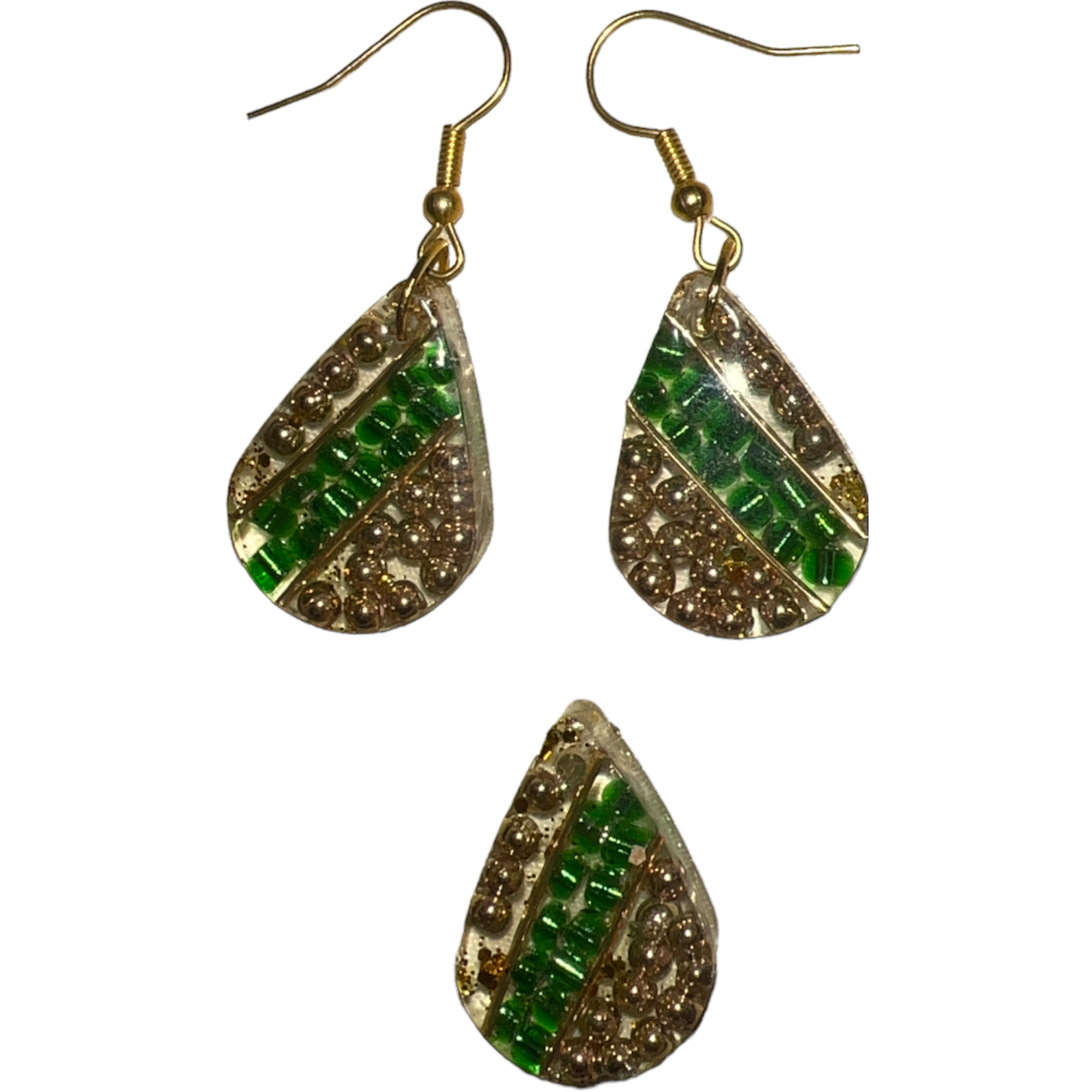 Goldish green beautiful handmade earring paired with a pendant made of glass beads embedded in resin gives you a unique style with transparency to match your outfit.
